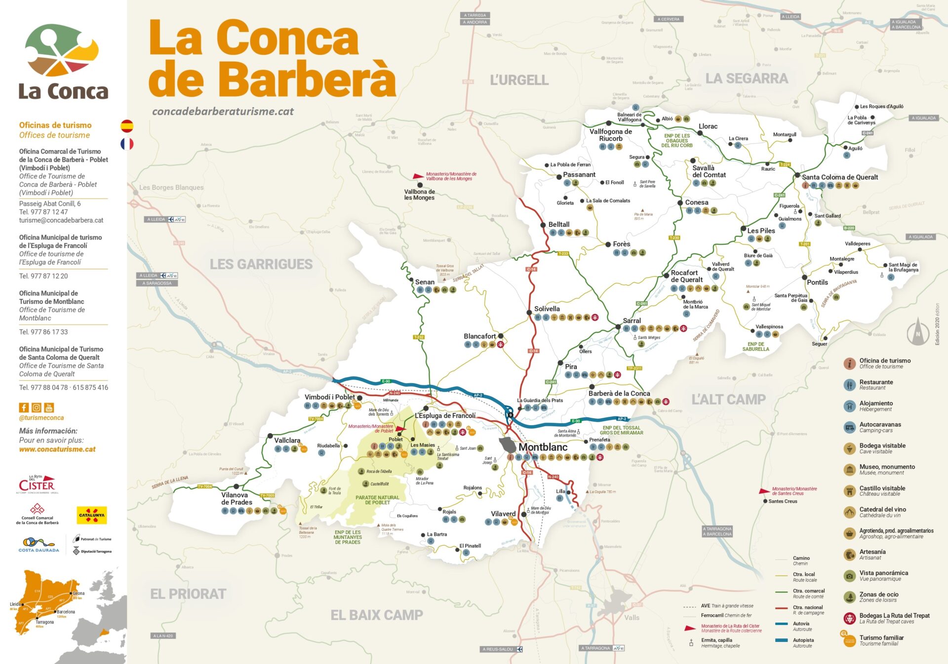 A partir de la visita al monasterio de Poblet o pasear por las calles medievales de Montblanc, el visitante puede retroceder en el tiempo. Puede viajar a la prehistoria, visitando las Cuevas de l’Espluga de Francolí o las pinturas rupestres de Montblanc (Patrimonio de la Humanidad); continuar en el tiempo hasta la Edad Media, y descubrir otros pueblos medievales como: Conesa, Forès, Solivella, Santa Coloma de Queralt, Vallfogona de Riucorb… O seguir las huellas del modernismo, un estilo que da respuesta a la necesidad de adaptarse a los avances tecnológicos ya las nuevas necesidades sociales y mercantiles de inicios del siglo XX, como son las bodegas modernistas, declaradas por la Generalidad de Cataluña Bienes Cultural de Interés Nacional; hacer una cata de vinos de la DO Conca de Barberà y pasear por los viñedos; realizar actividades en la naturaleza, como caminar por los espacios protegidos como el Paraje Natural de Poblet, las montañas de Prades, la sierra de Miramar y el Tossal Gros, la Sallida,…; visitar los museos y espacios culturales y conocer el trabajo de los artesanos…